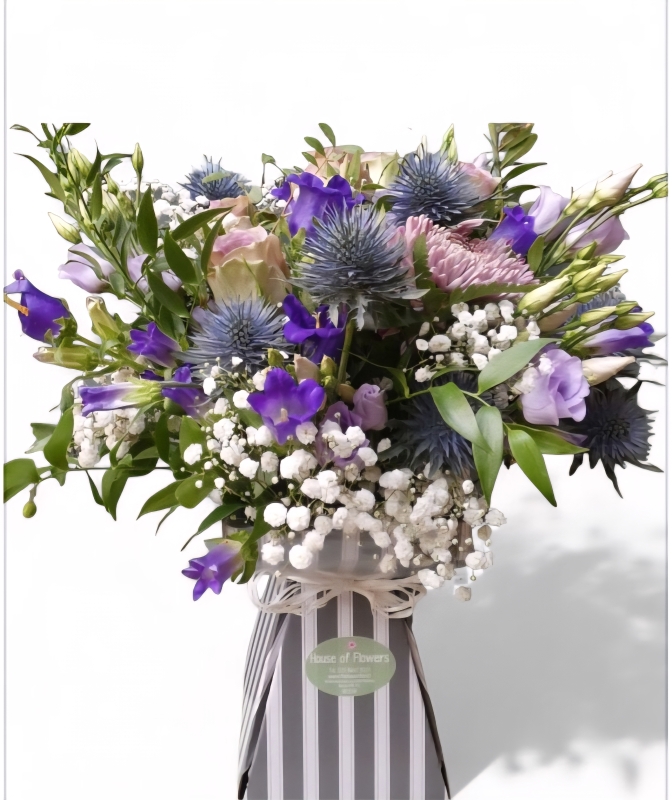 Beautiful hand tied bouquet presented in a sustainable recyclable water vase.