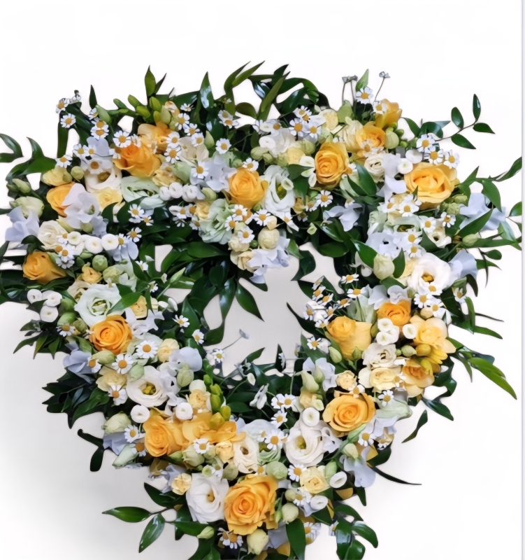 This open-heart arrangement includes fresh pastel seasonal blooms and foliages