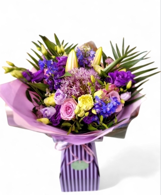 Soft lilacs, mauves and greens in this pretty bouquet with seasonal foliage. comes hand tied presented in a sustainable water vase.