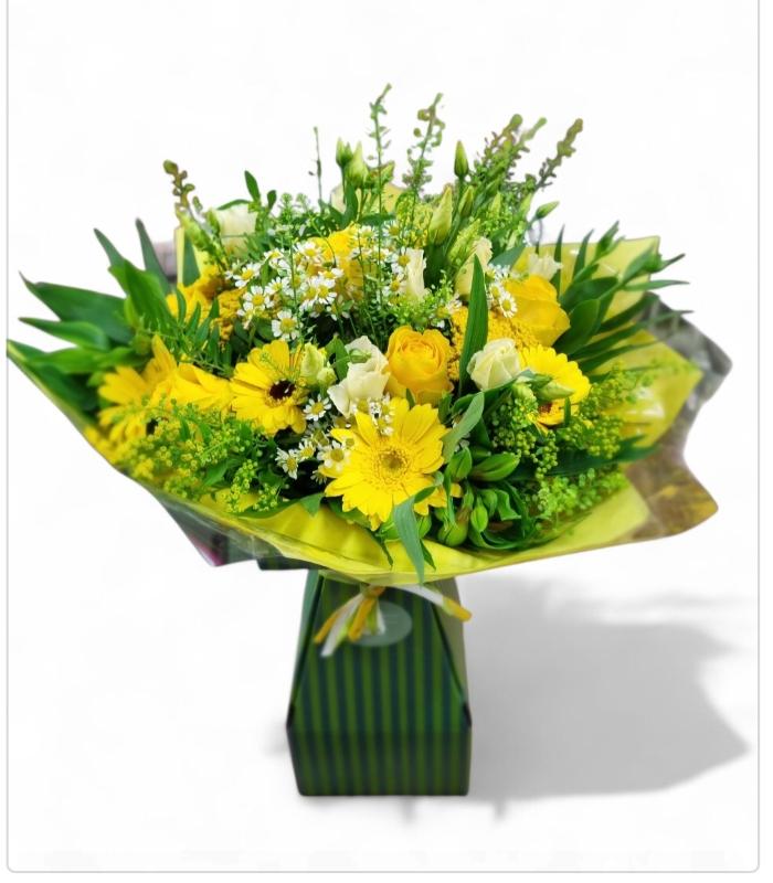 Yellow and white seasonal flowers and foliage in this pretty hand tied bouquet. Flowers used will depend on seasonal availability .