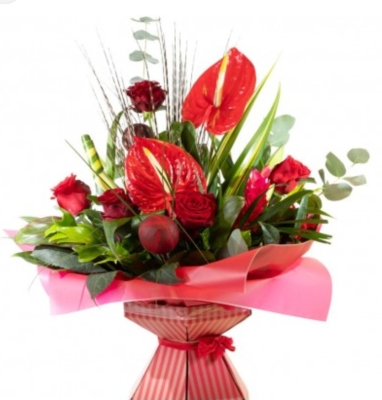 Beautiful vibrant bouquet with luxury long stemmed roses, striking Anthuriums and Eucalyptus.