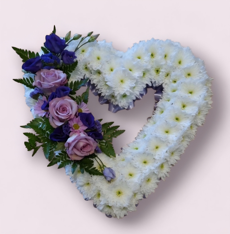 Beautiful open heart tribute based in white chrysanthemum doubles with a Lilac flower cluster and matching ribbon.