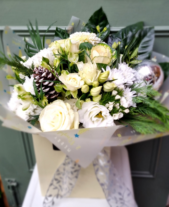 Our frosty morning bouquet consists of white seasonal blooms and a touch of festive sparkle.