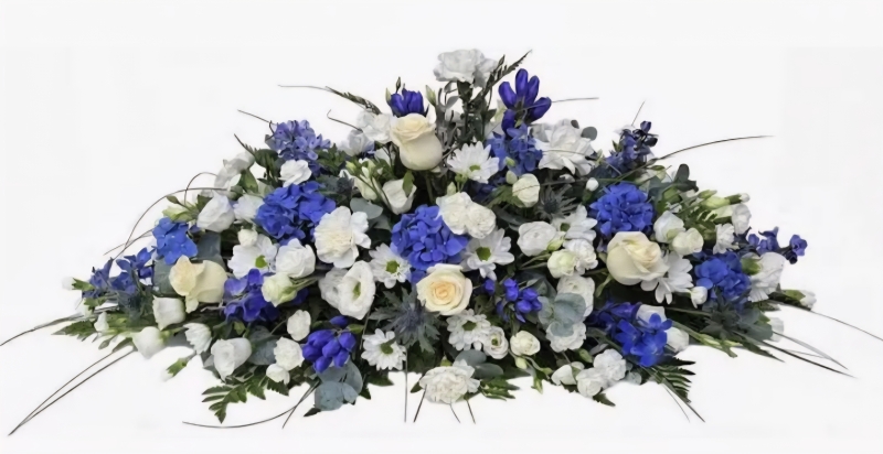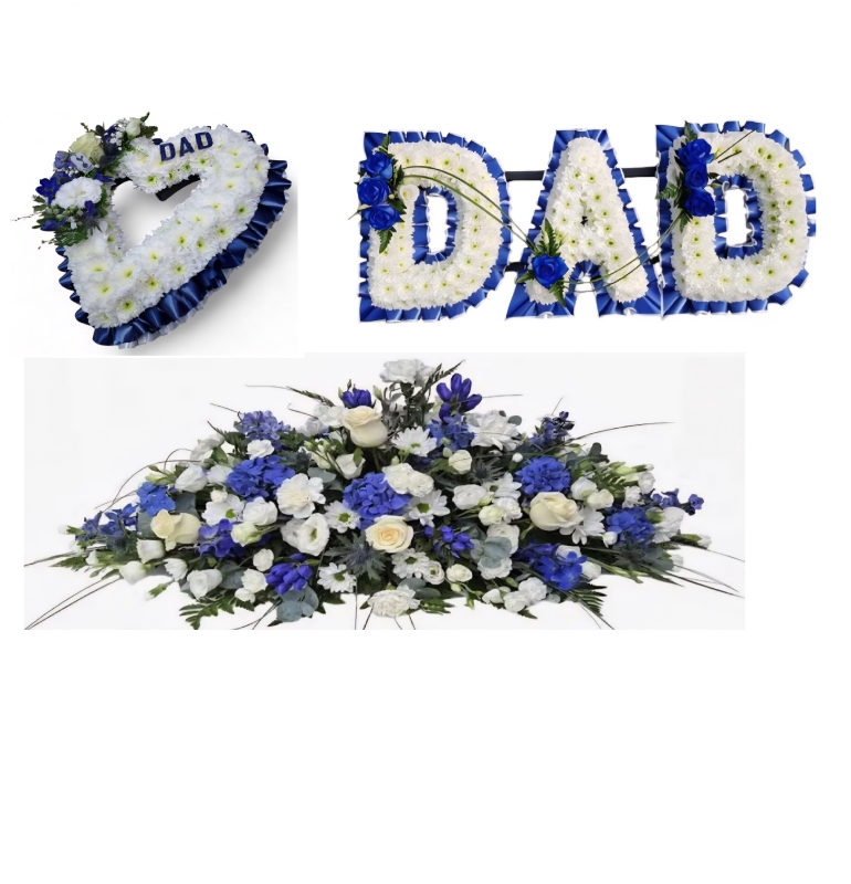 In this Blue collection you will get a 3ft Casket spray, A 12" pillow and a Dad tribute. The total for these individual tributes is £400 as a collection will be £350