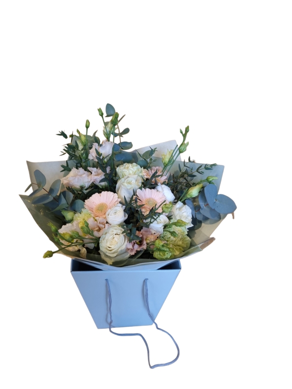 Pastel arrangement made with seasonal blooms in a presentation water vase.